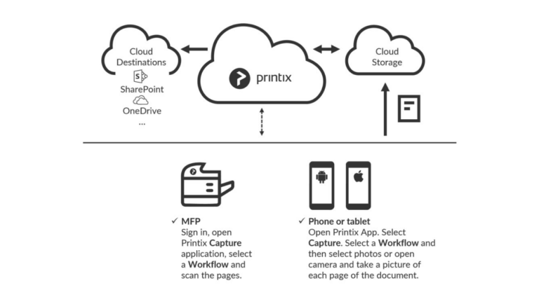 On certain multifunction printers (MFPs) equipped with Printix Go, you can activate Printix Capture to send scanned documents directly to Email, OneDrive, and SharePoint Online. You can also utilize the Printix App on your mobile device to capture and send images as Word or PDF files to your chosen workflow destination. Printix Capture is currently compatible with HP, Konica Minolta, and Ricoh printers.